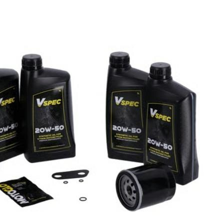 Includes: 4 liters SAE 20W50 3-1 full synthetic engine / primary / transmission oil, 63805-80A oil filter black, 34986-04 inspection cover gasket, 11105 O-ring drain plug, 11171 O-rings inspection cover screws. Quality 20W50 full synthetic Vspec oil. Special All in One solution blend for use as engine / primary / transmission oil. Okay to mix with all mineral and semi-synthetic oils. Meets or exceeds JASO MA/2. Our 'Big Oil' kit includes enough Vspec engine, transmission and primary oil to service the specific models as mentioned. Kit includes a chrome or black spin-on oil filter and all required drain plug seals and a primary derby/inspection cover gasket/seal to get the job done. The 'Big Oil' kit is perfect to full oil-service your bike during a regular service interval or before you store it for the for the winter period. Note: Comes with genuine Vspec high quality motor oil for all stock to high output engines. Note: OEM part numbers are given for reference only. Note: Used oil may contain harmful acids and/or other contaminants. Therefore it is advised to do an oil and filter change before winter storage. Note: Check your service manual for the recommended factory oil change intervals and oil change quantities.