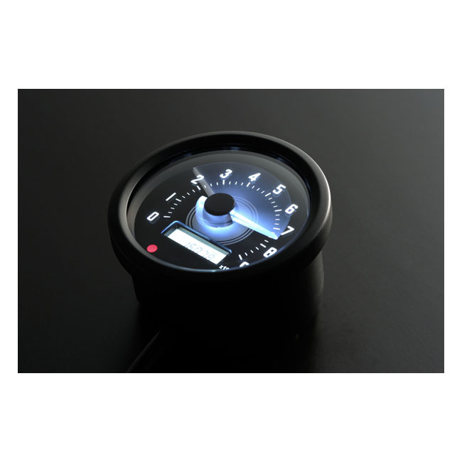 Black face; Black housing; Comes with programmable red LED shift light; Digital LED screen functions include RPM, max. RPM memory and recall; Volt meter with 0-18V range; Dimensions: 60mm diameter and 48mm high